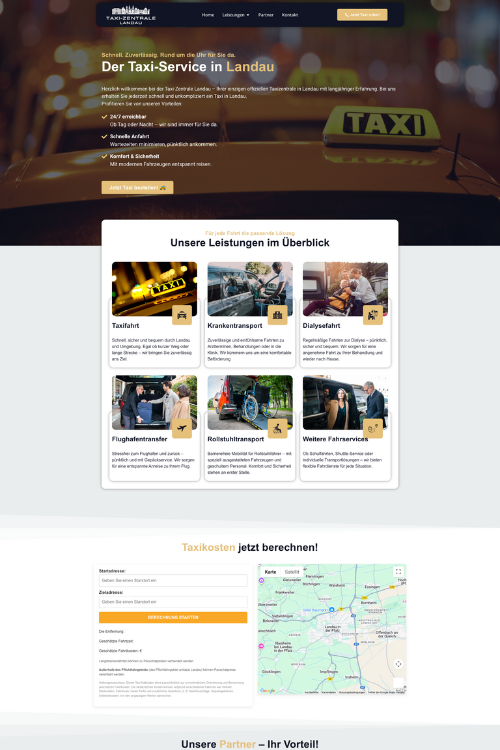 Vor unserer Zusammenarbeit hatte die TaxiZentrale Landau noch gar keine eigene Webseite. Kunden konnten die Fahrdienste nur telefonisch erreichen und viele Anfragen gingen dadurch verloren. Gemeinsam haben wir eine moderne Webseite entwickelt, die Fahrgästen eine einfache und schnelle Möglichkeit bietet, ein Taxi direkt online zu kalkulieren und zu buchen.
